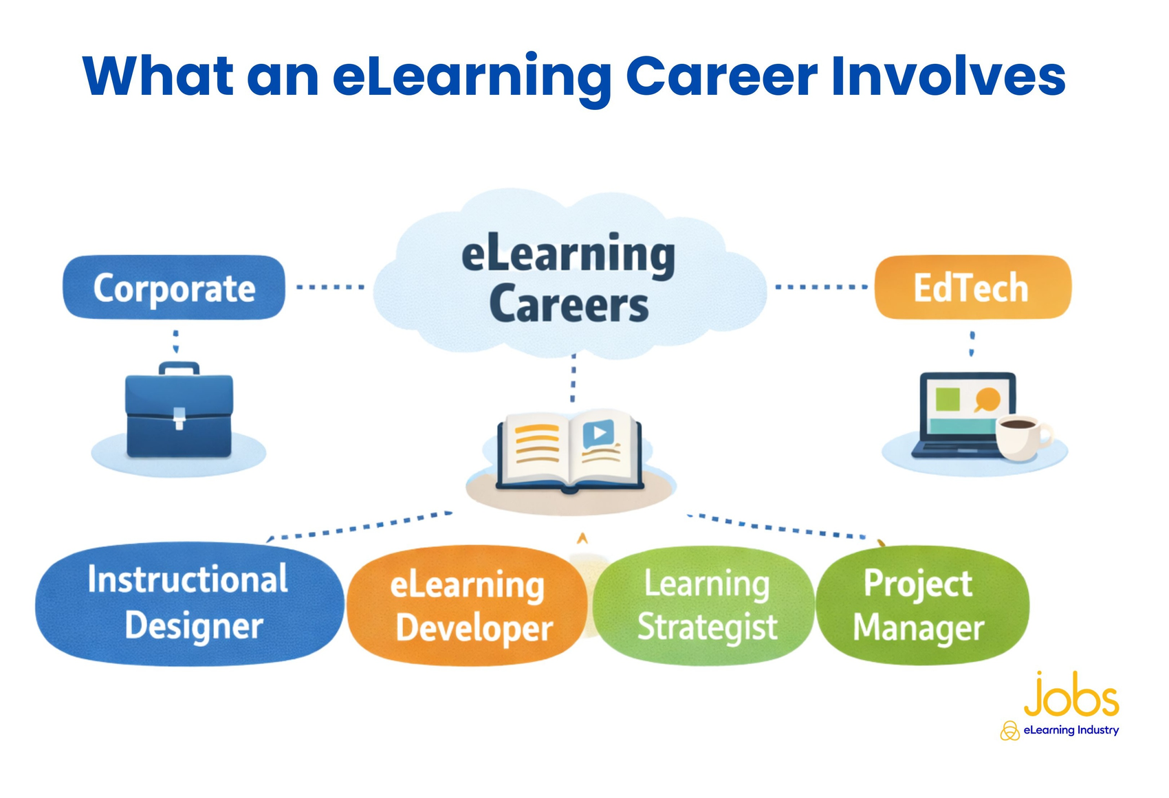 An eLearning career goes far beyond uploading slides into an online platform and delivering them to your audience. It involves designing intentional learning experiences that help people build knowledge and skills efficiently. Common roles in the field include Instructional Designers, eLearning developers, Learning Experience (LX) designers, learning strategists, multimedia specialists, and learning project managers. Each role combines education principles and methodologies with technology, creativity, and performance outcomes.