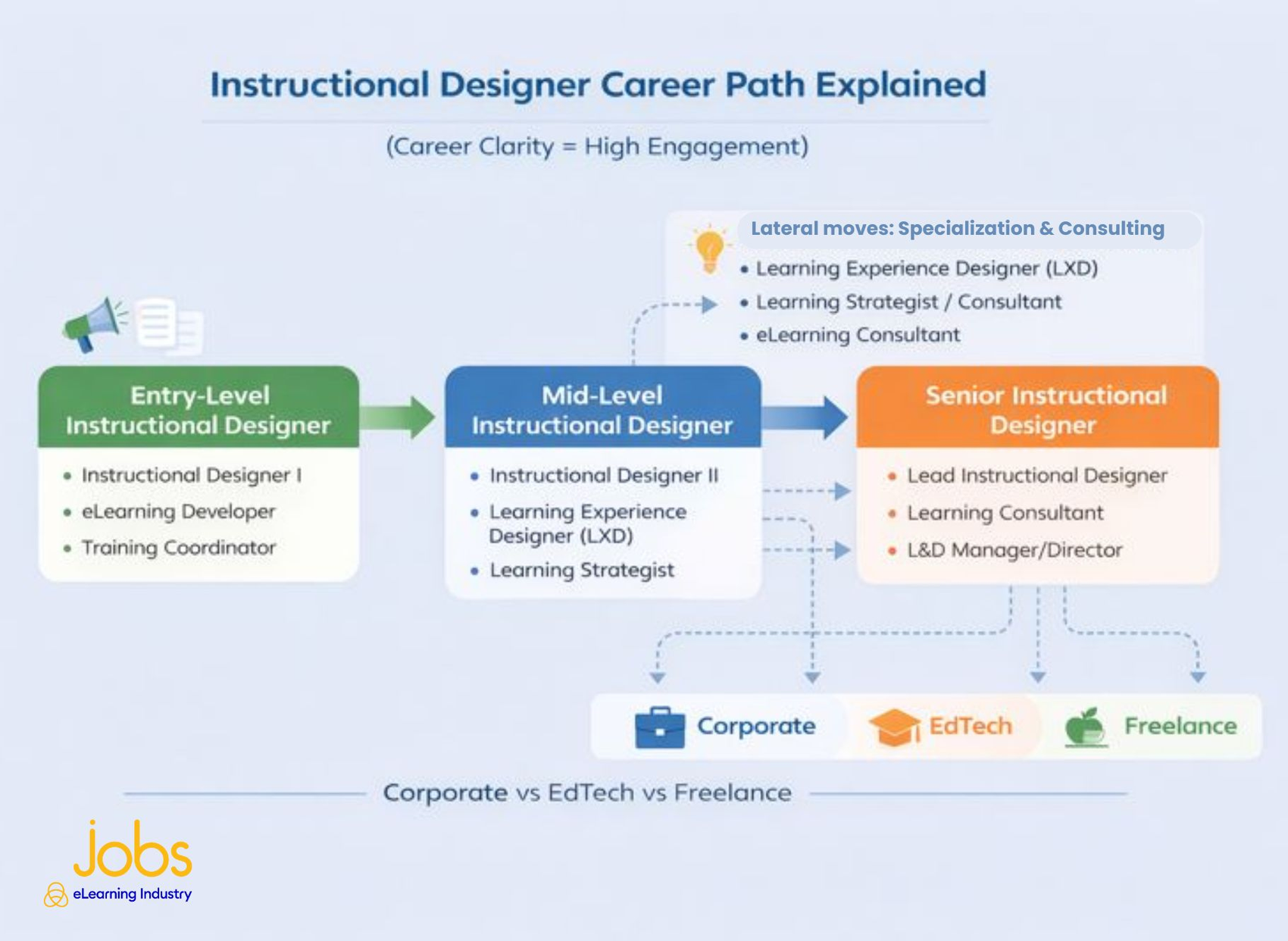 It's important to point out that career paths vary significantly depending on the work environment. For instance, in corporate settings, Instructional Designers focus more on employee performance, compliance, and upskilling that's tied to business outcomes. While EdTech roles center on building scalable digital learning products. In this case, you often have to collaborate with product, engineering, and marketing teams. Then there are freelance Instructional Designers who enjoy flexibility and project variety but must manage client relationships, business development, and income stability from project to project.