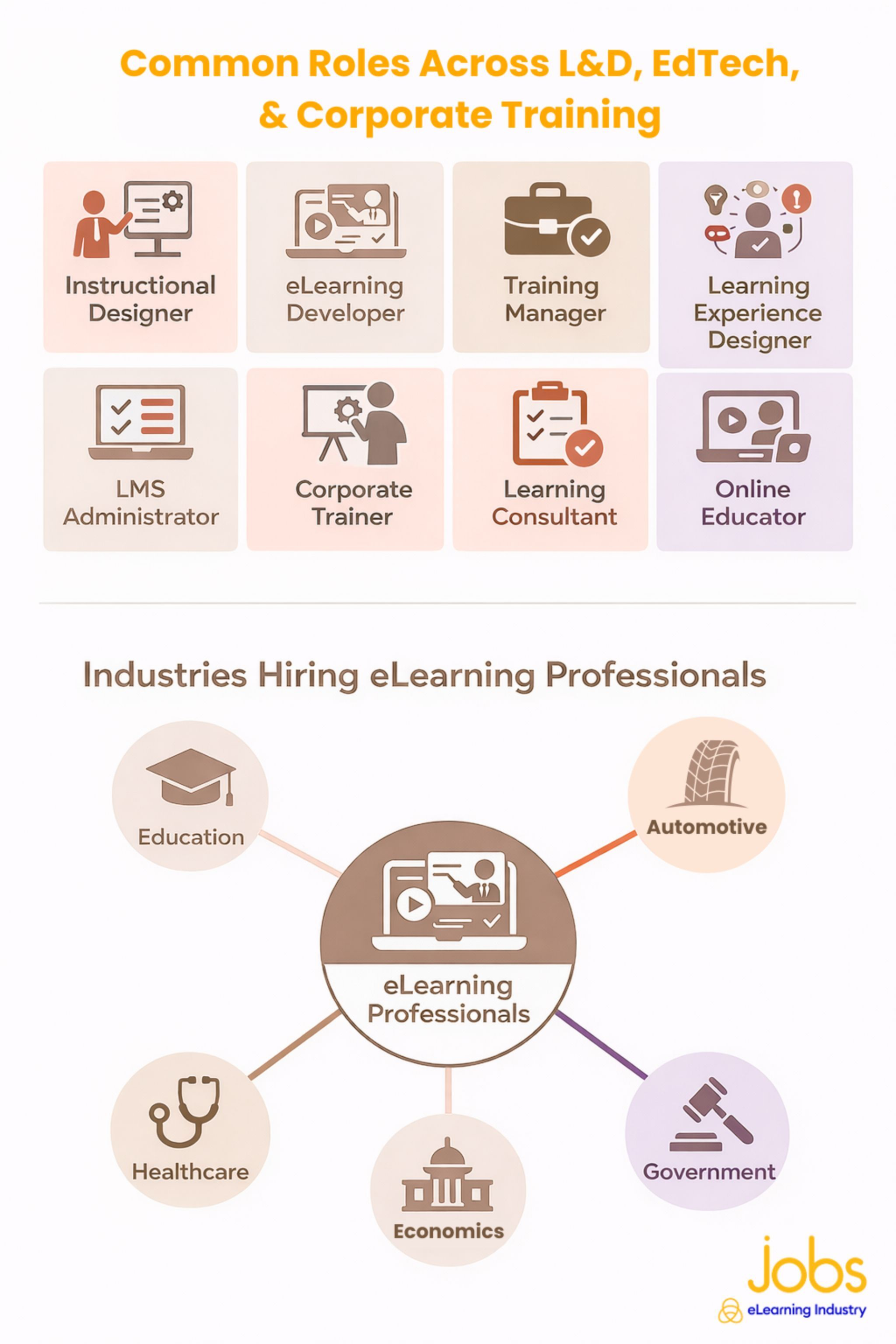 Learning and development (L&D), EdTech, and corporate training are some of the most common sectors where you'll find eLearning pros. These roles include Instructional Designers, eLearning developers, Learning Experience designers, LMS administrators, curriculum specialists, and learning consultants. Some roles lean more toward pedagogy and strategy, while others focus on multimedia production, data analysis, or platform management.