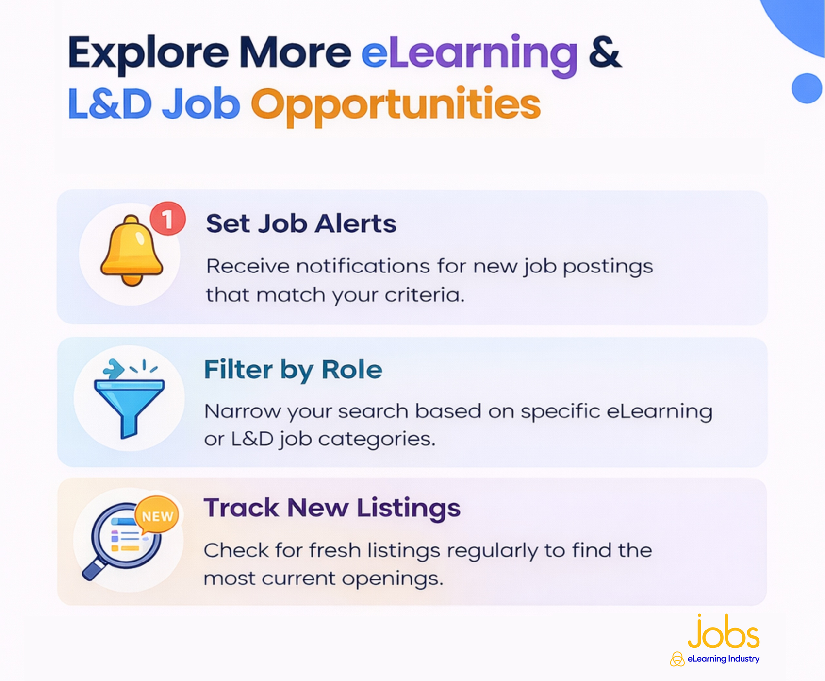 L&D Specialists are employed across nearly all sectors, particularly in corporate HR departments, consulting firms, and fast-growing startups focused on employee development. These eLearning job openings are typically hybrid or remote, depending on whether on-site facilitation or in-person training is required.